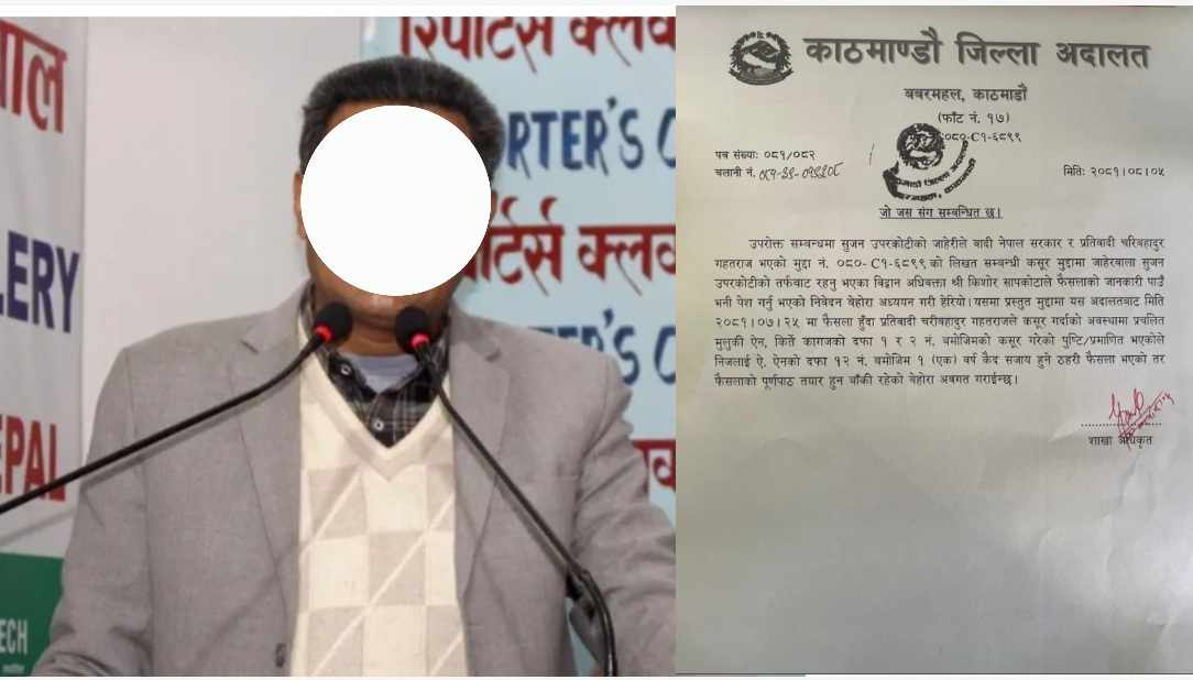 काठमाडौं जिल्ला अदालतकाे मिति २०८१ साल कार्तिक २५ गत्तेकाे फैसला अनुसार कसुरदार सि बि गहतराजलाई १ बर्ष कैदकाे सजाय सुनाईएकाे उक्त लिखित किर्ते सम्बन्धि जाहेरवाला सुजन उपरकाेटिका तर्फबाट बहसमा रहेका अधिवक्ता किशाेर सापकाेटाले बताएका छन्।