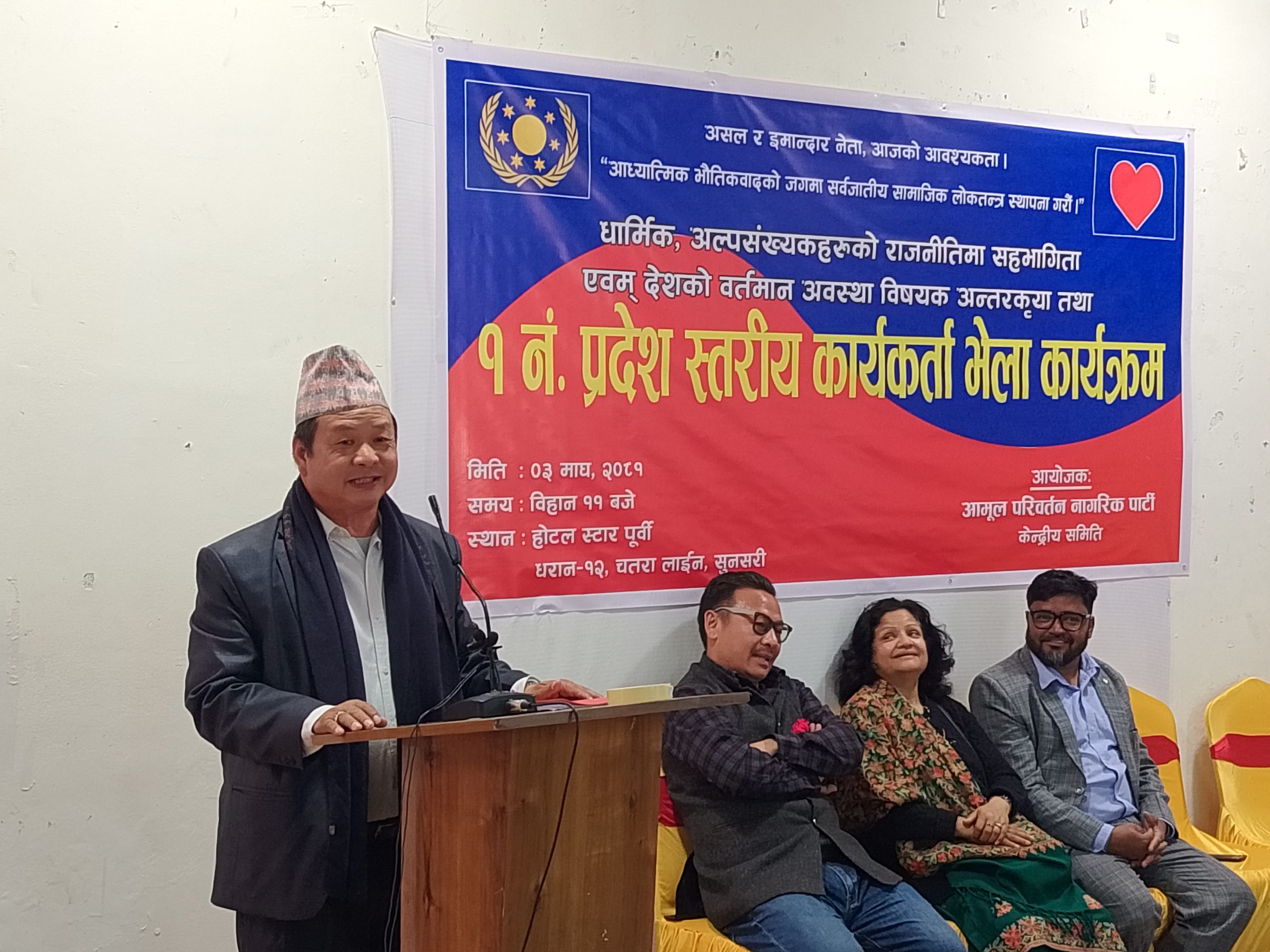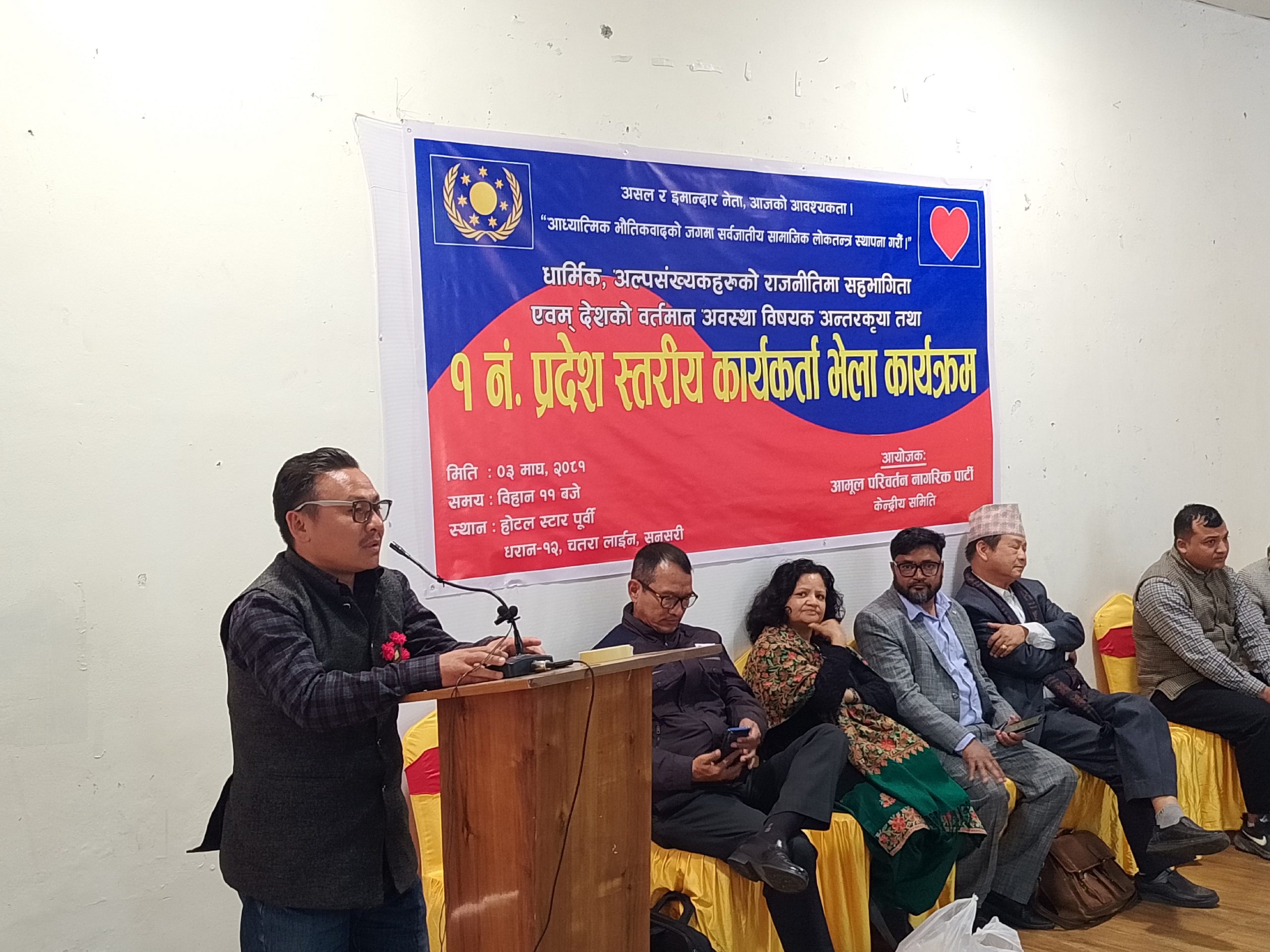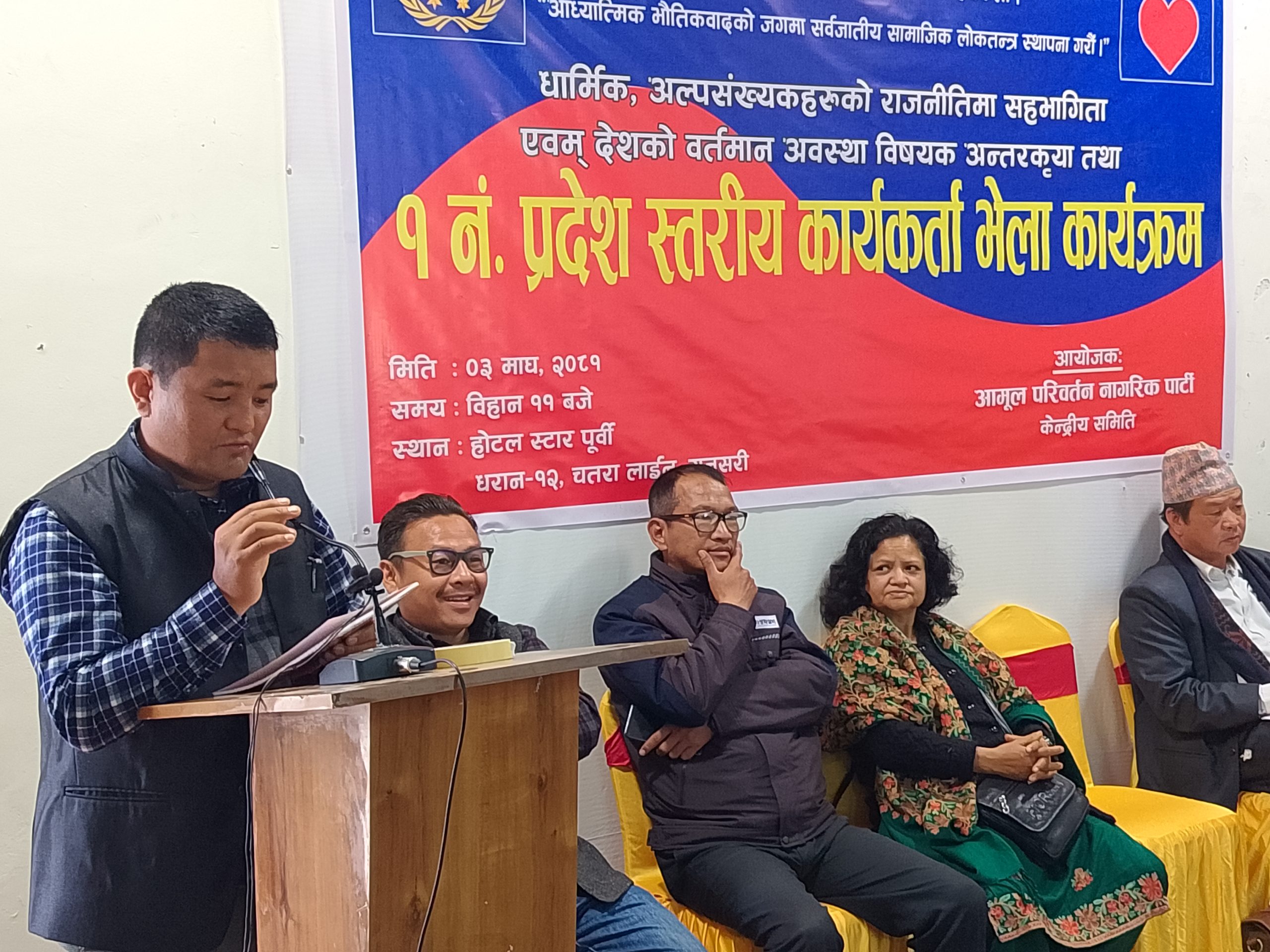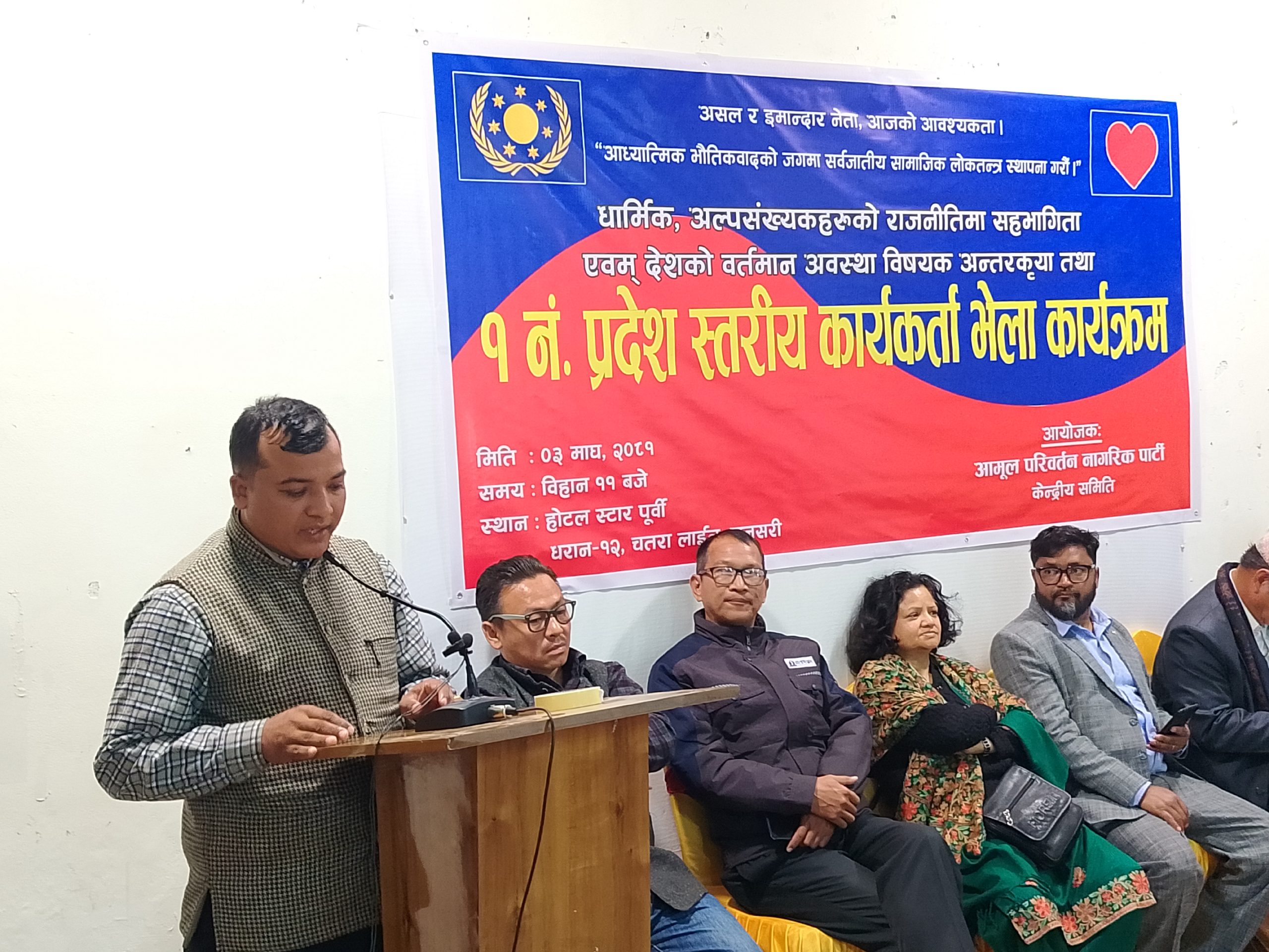 आमूल परिवर्तन नागरिक पार्टीको धार्मिक तथा अल्पसंख्यकहरुकाे राजनीतिमा सहभागिता तथा देशकाे वर्तमान अवस्था विषयक अन्तरक्रिया र १.नं . प्रदेश स्तरीय कार्यकर्ता भेला धरानको स्टार पूर्वी होटेलमा सम्पन्न भएको छ।
