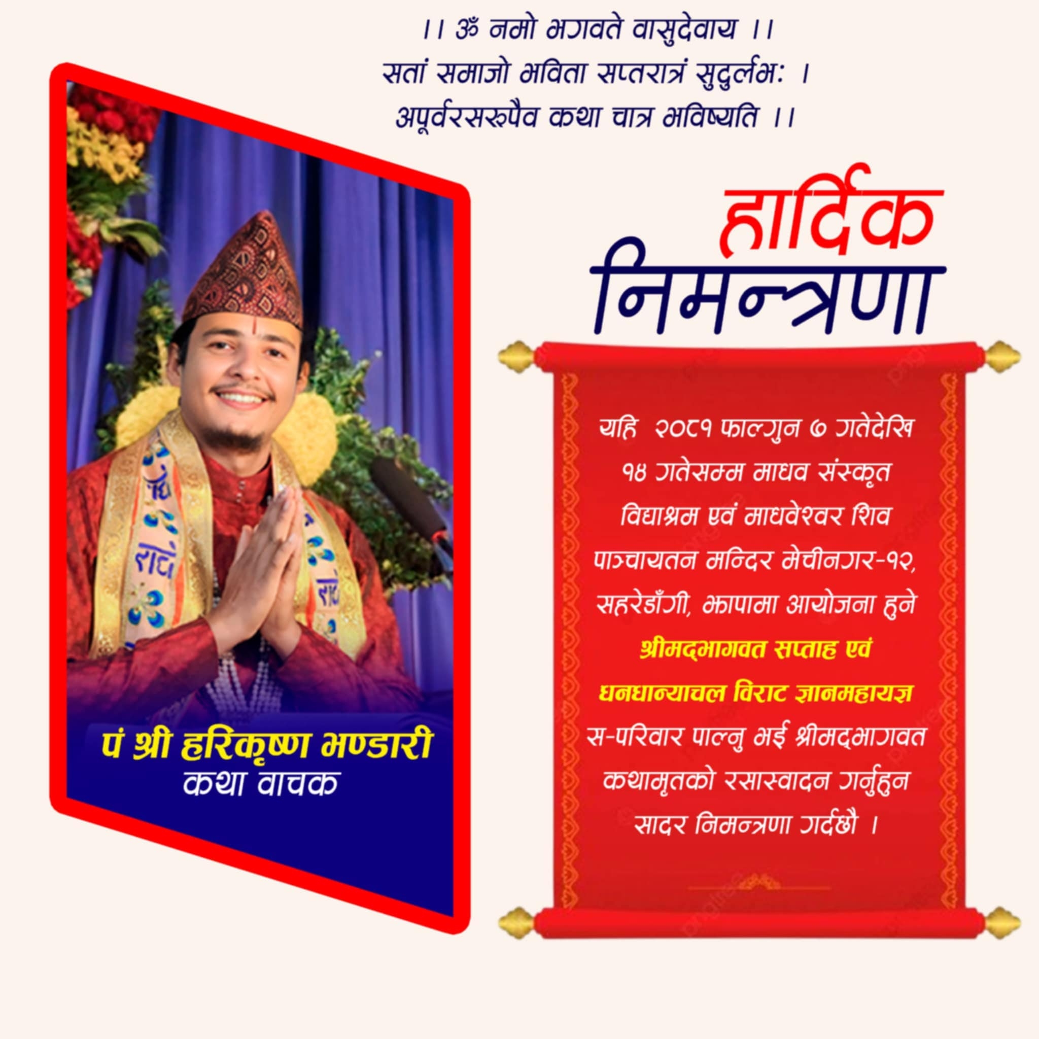 झापा ।सञ्चारकर्मी हरिकृष्ण भण्डारीको नामको अघि अब पण्डित उपाधि थपिएको छ । झापा मेचीनगर १२ सहरेडाँगीका भण्डारी श्रीमद् भागवतको कथावाचकको रुपमा उदाउँदै छन् ।