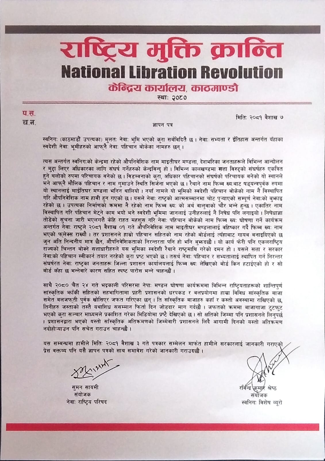नेवाः राष्ट्रका जनताहरू जिल्ला प्रशासन कार्यालयलाई फिब्व ख्यः लेखिएको बोर्ड किन हटाईएको हो र सो बोर्ड कँहा छ भन्नेवारे पनि स्पष्टिकरण सोधिएको छ।